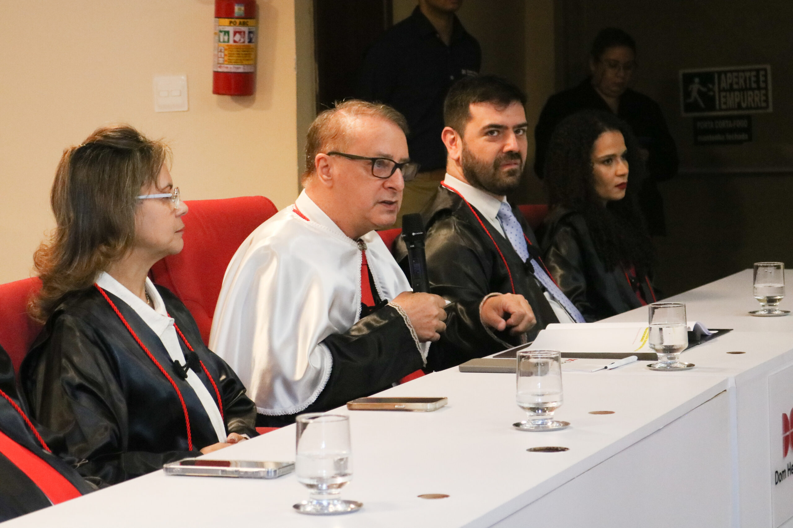 A mesa solene foi composta pelo reitor da Dom Helder, Paulo Umberto Stumpf; pelos pró-reitores Francisco Haas, José Antônio de Sousa Neto, Anacélia Santos Rocha e Caio Lara; e pela coordenadora do curso, Helen Cristina de Almeida Silva.