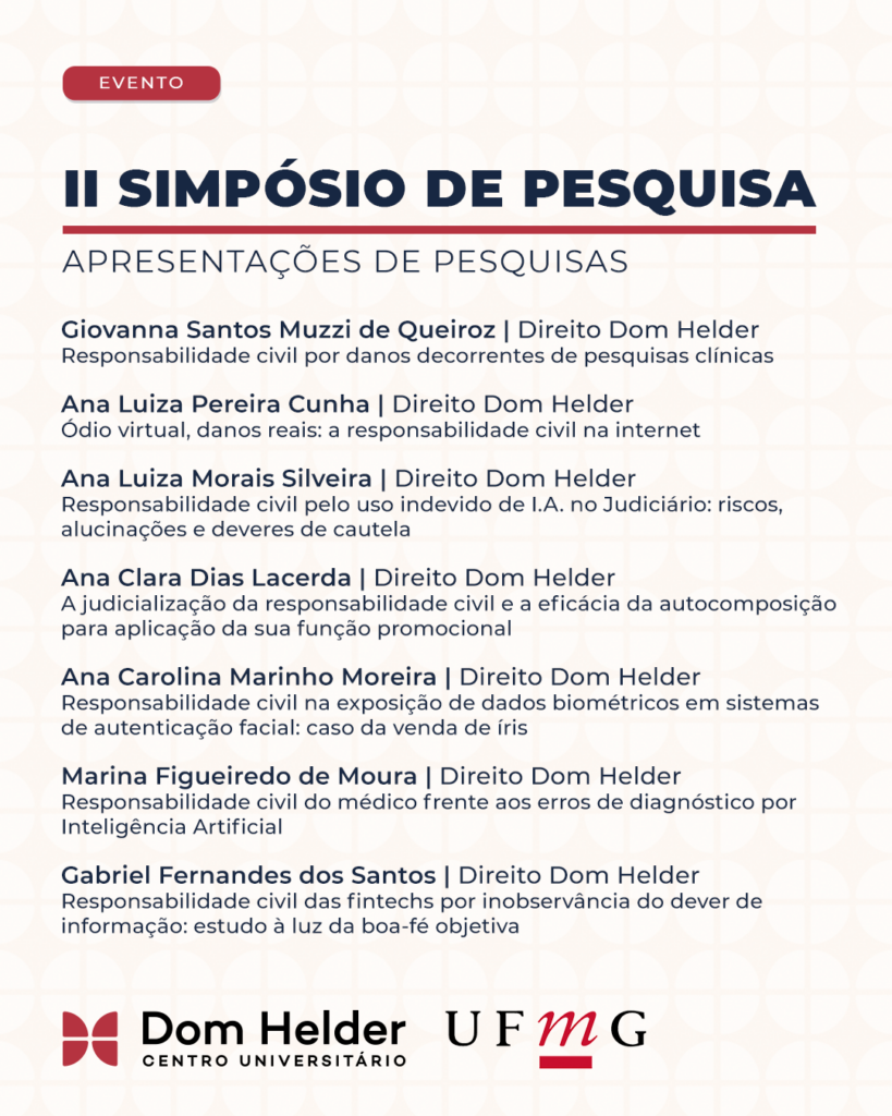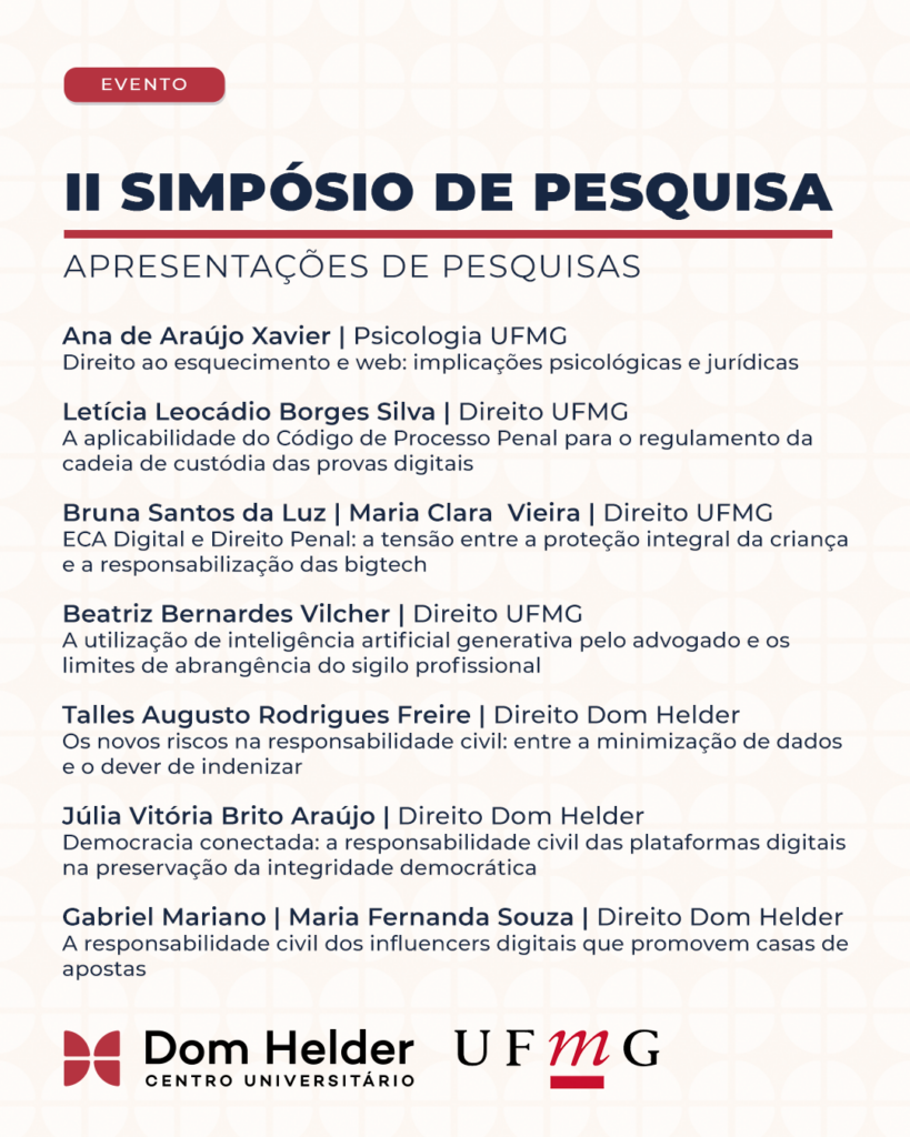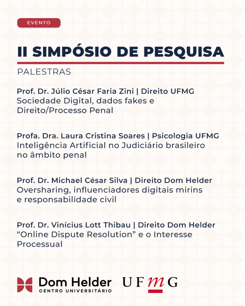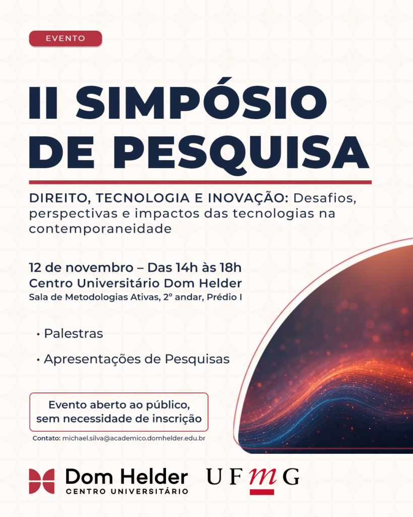 O Centro Universitário Dom Helder sediará, nesta quarta-feira (12), o II Simpósio de Pesquisa, promovido em parceria com a Faculdade de Direito da UFMG.