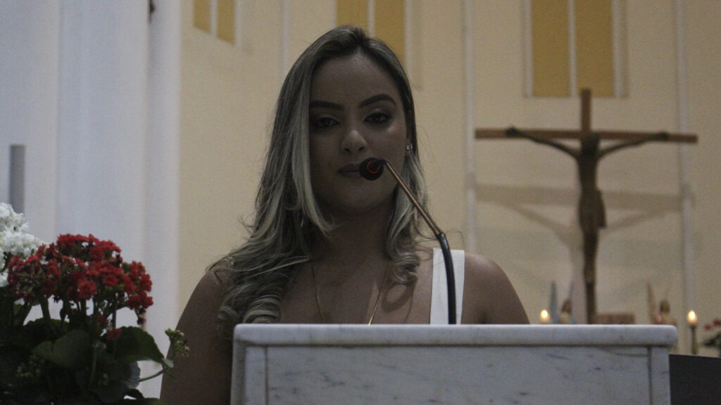 Formanda durante entrega de canudo ao Padre Eduardo Henriques