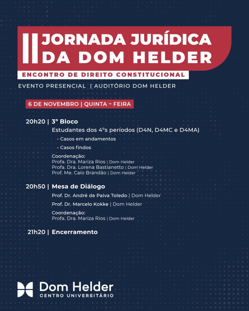 Nos dias 6 e 7 de novembro, o Centro Universitário Dom Helder promoverá a II Jornada Jurídica – Encontro de Direito Constitucional.