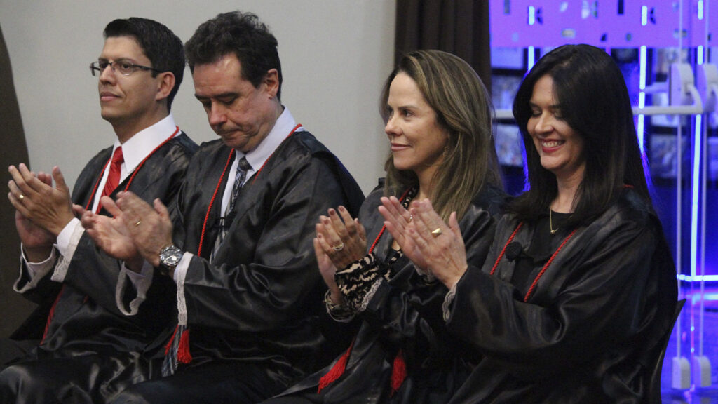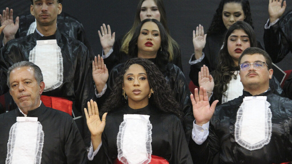 A mesa solene foi composta por diversas autoridades acadêmicas, incluindo o Vice-Reitor, Professor Franclim Brito; a Pró-Reitora de Administração, Professora Anacelia Santos Rocha; o Pró-Reitor de Pesquisa, Professor Caio Augusto Lara; o Pró-Reitor de Extensão, Professor Francisco Haas; o Pró-Reitor de Internacionalização, Professor Kiwonghi Bizawu; e a Coordenadora do Curso de Graduação em Direito, Professora Helen Cristina de Almeida.
