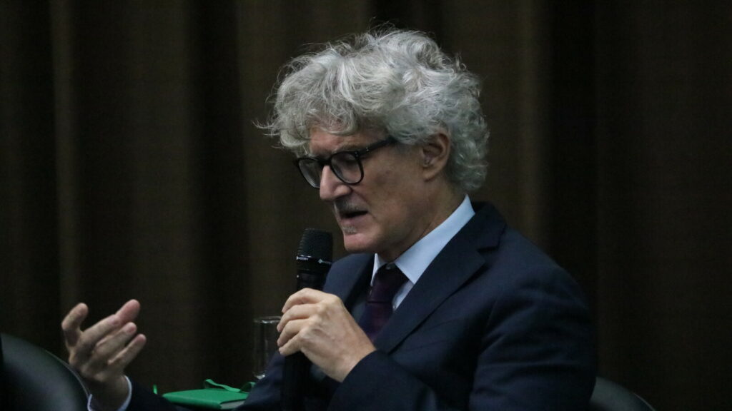 Encerrando a série de exposições, o palestrante Saverio Di Benedetto, Colíder do Grupo de Pesquisa Estratégico da Pan-Amazônia e Professor de Direito da Università del Salento (Itália), apresentou a palestra “A atividade do Grupo de Pesquisa Estratégico da Pan-Amazônia como paradigma de pesquisa transdisciplinar”.